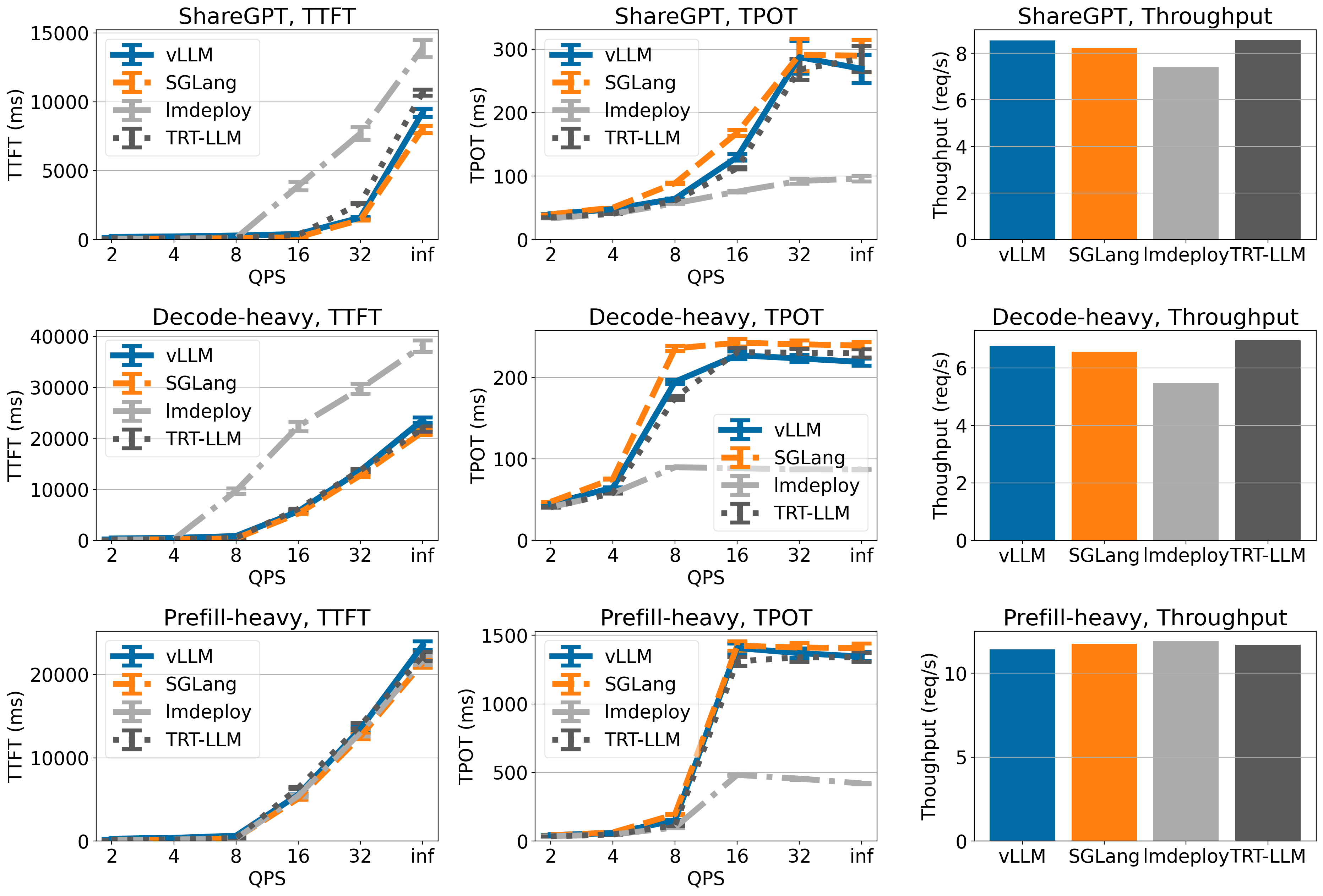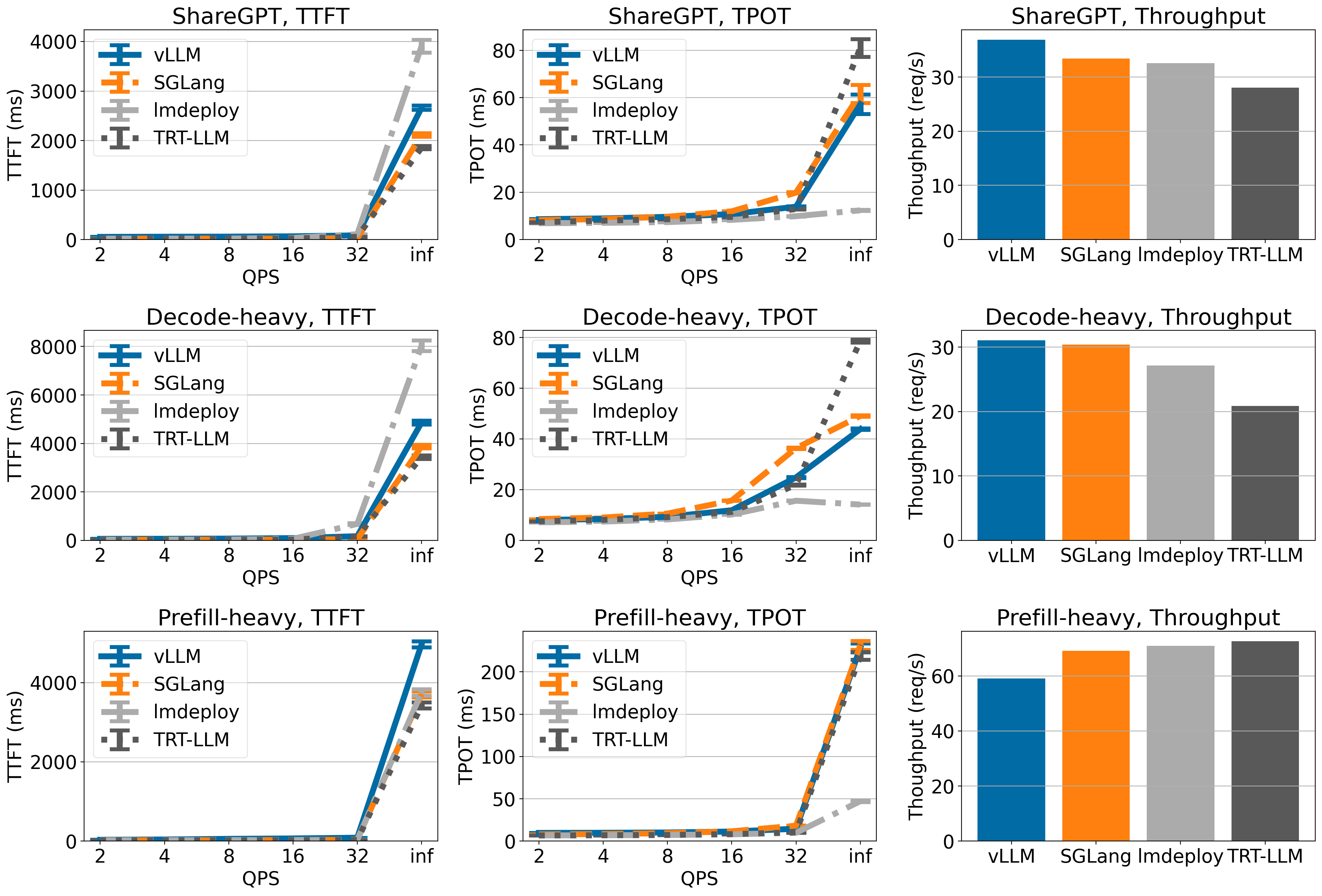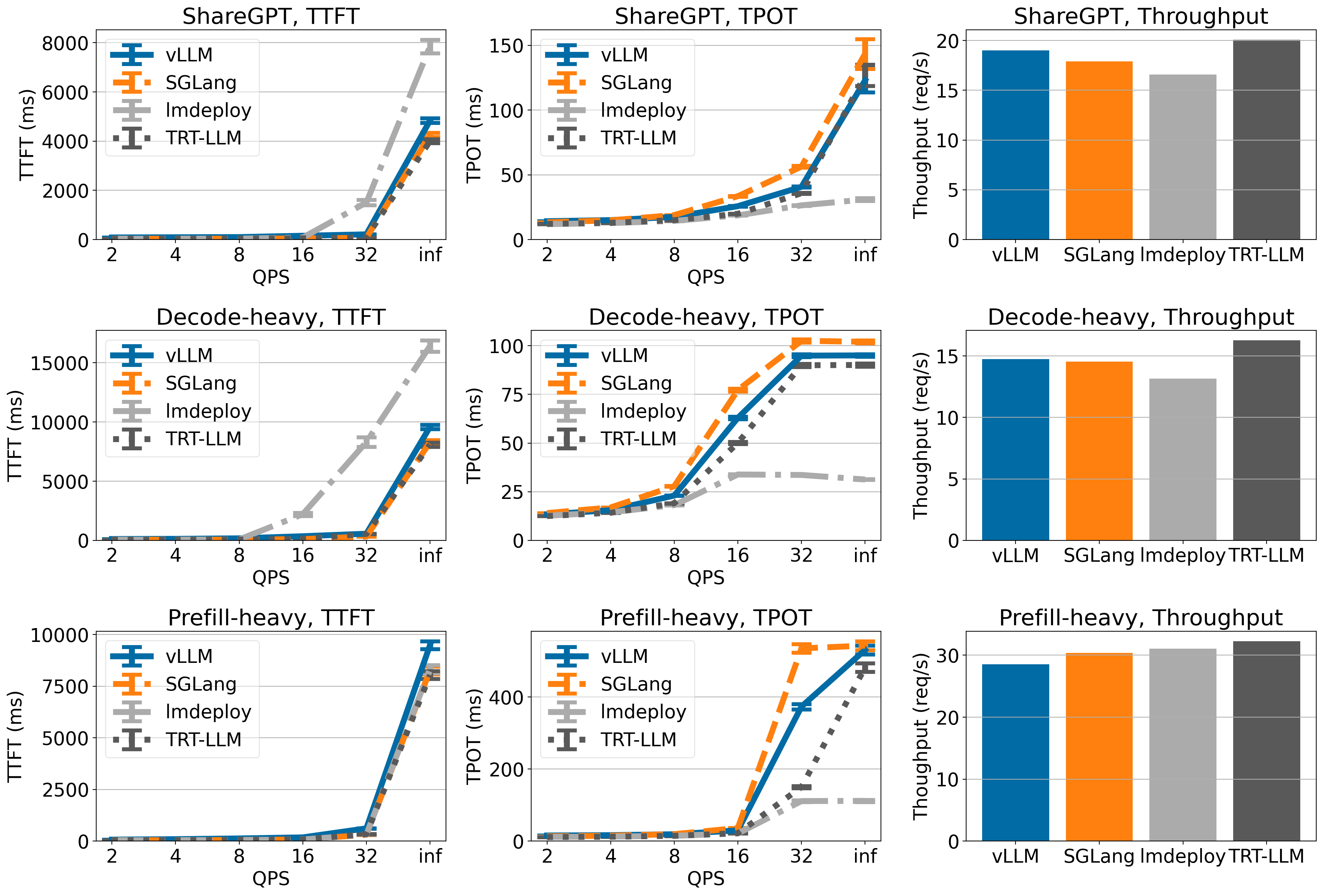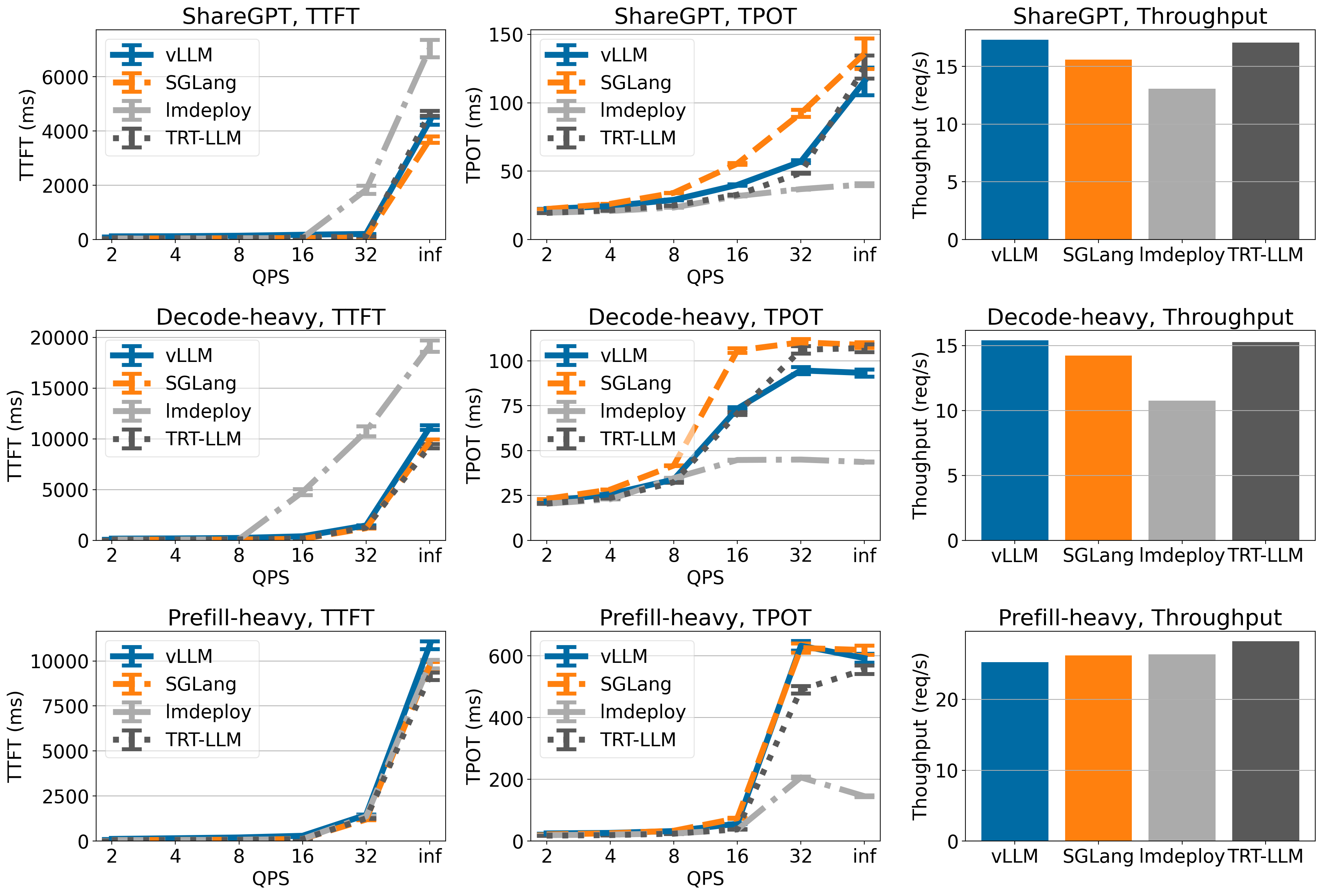 Serving engines. We benchmark the vLLM v0.6.0 against TensorRT-LLM r24.07, SGLang v0.3.0, and lmdeploy v0.6.0a0. For other benchmarks, we use their default setting. For vLLM, we have turned on multistep scheduling via setting --num-scheduler-steps 10. We are actively working on making it on by default.